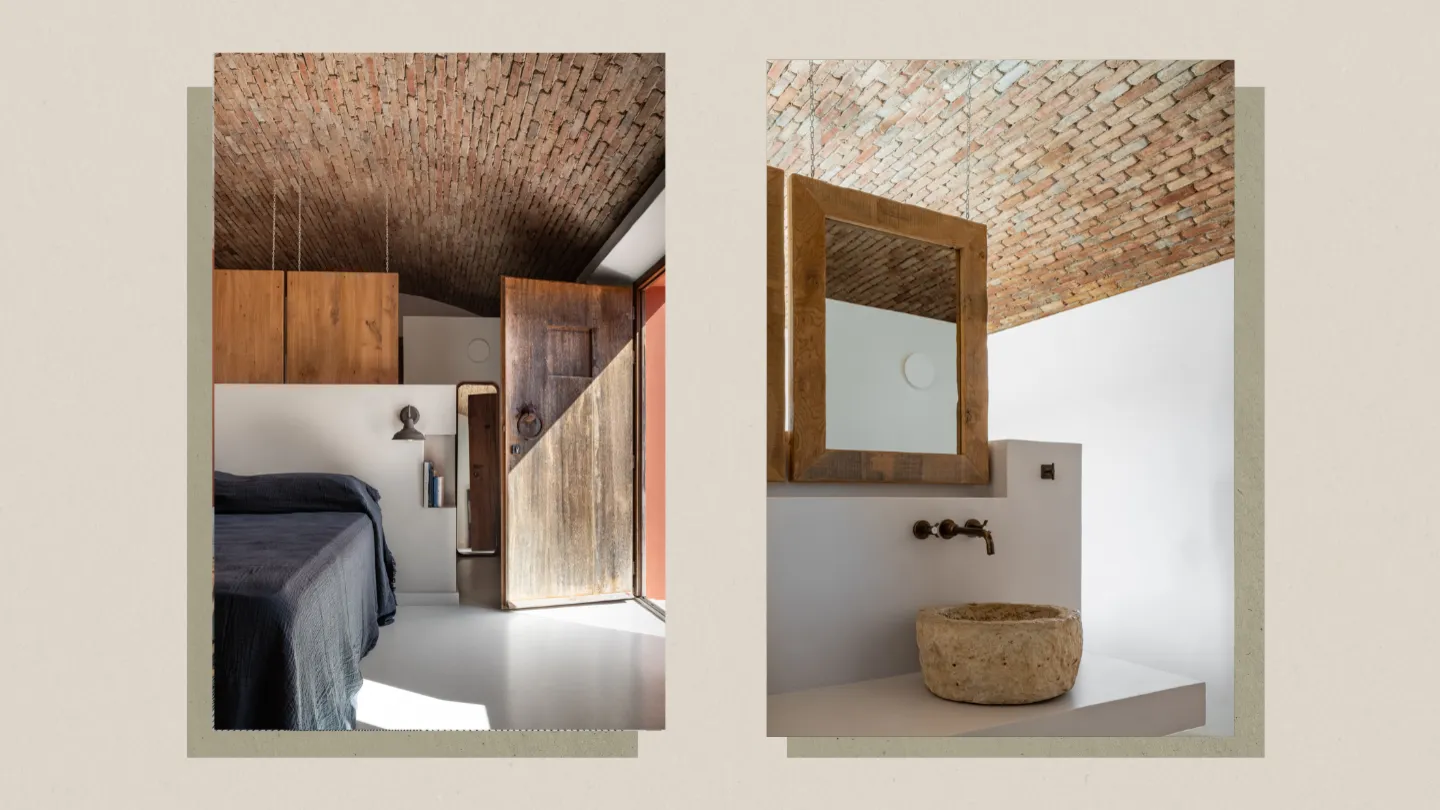 Os tons naturais do mobiliário contrastam com a cor terracota da envolvente que se desenvolve em dois níveis e diferencia os dois espaços interligados, sala e quarto.